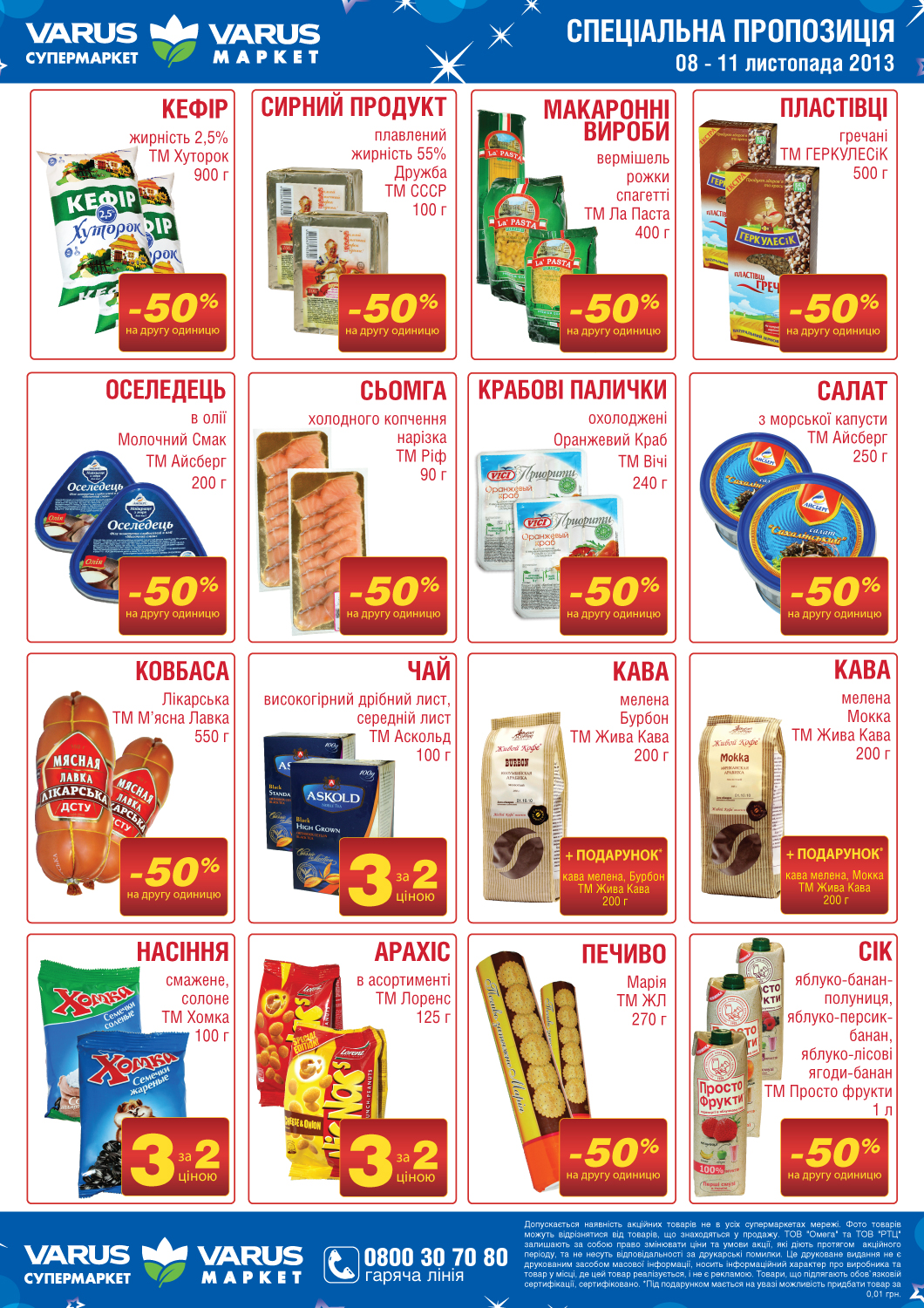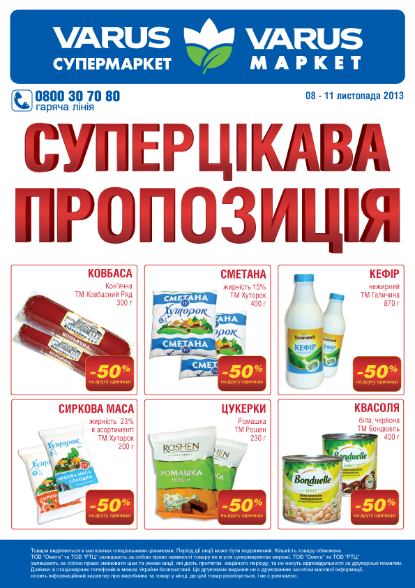 Супермаркет Варус акции. В «Варусе» акционные предложения, как правило, обновляются 1 раз в 2 недели, также есть специальные акции на 3-4 дня. Особое внимание администрация уделяет акциям, стимулирующим покупателей приобретать больше, и гарантирует скидки при покупке второго и третьего товара.
